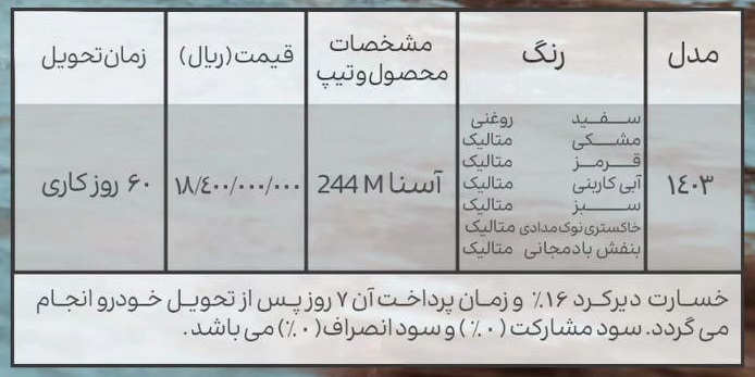 به گزارش کارنامه، شرکت آمیکو، در جدیدترین شرایط فروش اعلامی برای پیکاپ دو کابین آسنا، این خودرو را به صورت نقدی و با موعد تحویل ۶۰ روز کاری بدون محدودیت عرضه میکند. متقاضیان میتوانند با مراجعه به وب سایت این شرکت و یا نمایندگیهای مجاز آمیکو در سراسر کشور نسبت به ثبتنام، واریز وجه و خرید قطعی اقدام کنند: