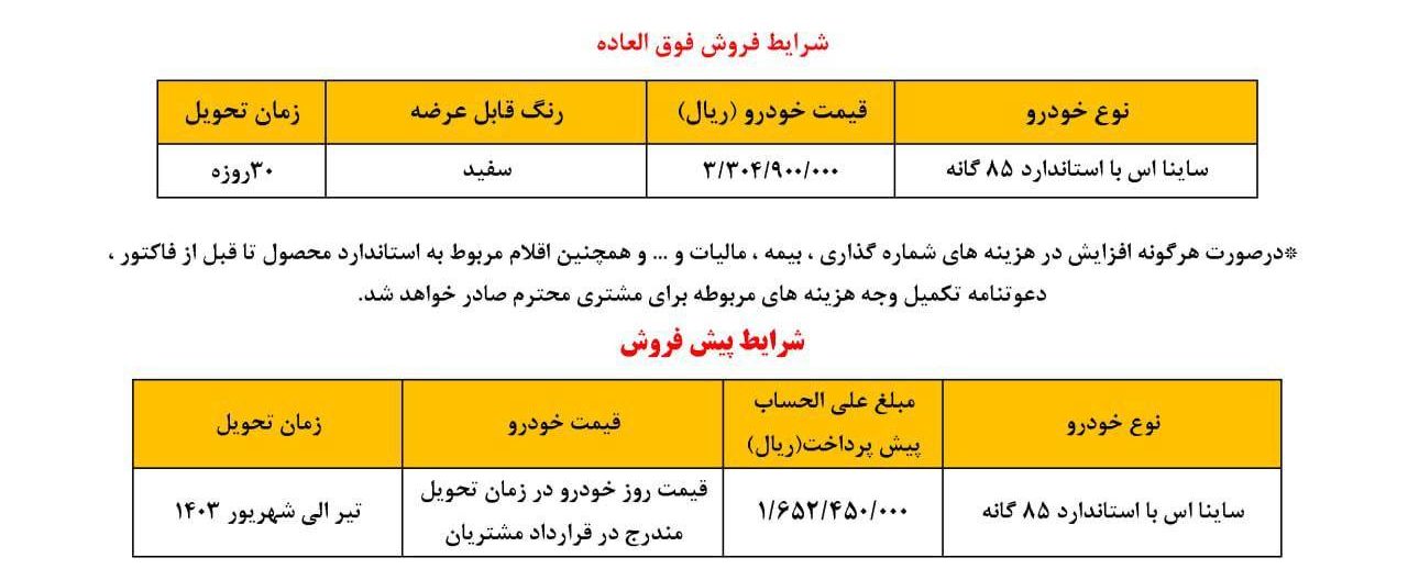 پیش فروش و فروش فوق العاده ساینا اس (آبان ۱۴۰۲)