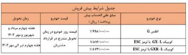 | نوع خودرو | موعد تحویل | پیش پرداخت (تومان) |