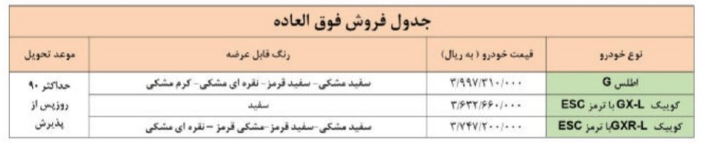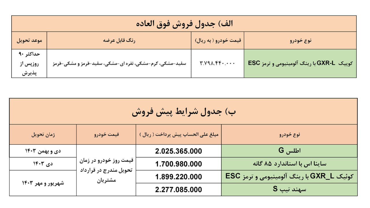 | نوع خودرو | موعد تحویل | قیمت (تومان) |