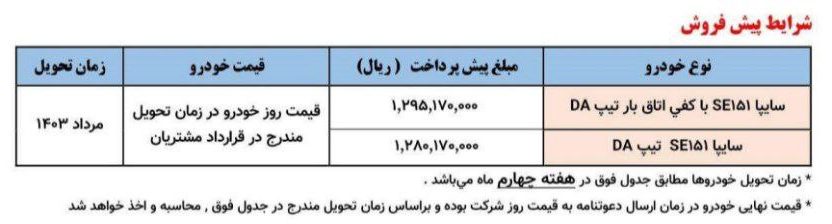 پیرو بخشنامه به شماره ۶۸۵۷۳ به اطلاع نمایندگی ها و متقاضیان حائز شرایطی که در سامانه یکپارچه عرضه خودرو در اردیبهشت ماه سال جاری نسبت به تغییر سفارش خود از محصولات سایر خودروسازان به محصولات گروه سایپا اقدام نموده اند و درخواست تحویل خودرو ایشان در طرح زمستان سال ۱۴۰۲ تائید گردیده می رساند شرایط فروش محصولات به شرح ذیل اعلام می گردد. بدیهی است جهت سایر متقاضیان که درخواست ایشان خودروی مذکور نبوده است متعاقباً اطلاع رسانی لازم صورت می پذیرد.