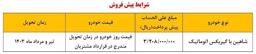 متقاضیان حائز شرایطی که در خرداد ماه سال جاری نسبت به ثبت نام اولیه خودرو شاهین اتوماتیک اقدام کردهاند و در تاریخ ۱۴۰۲/۱۰/۳۰ برایشان پیامک ارسال شده است، امکان واریز وجه خودرو و ثبت نام مطابق شرایط جدول زیر را دارند: