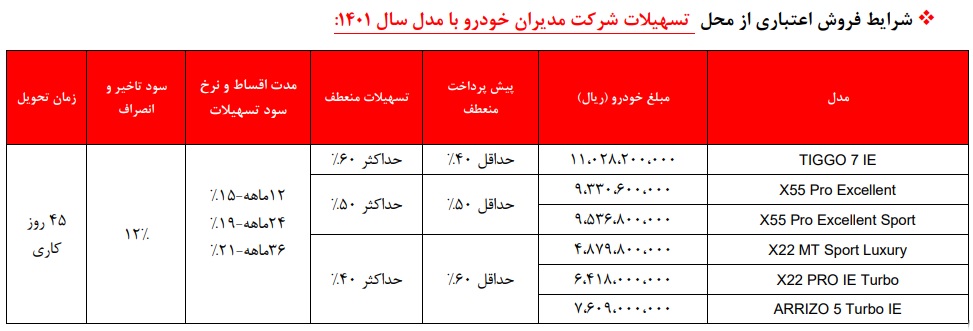 شرکت مدیران خودرو در جدیدترین شرایط فروش اعلامی ویژه متقاضیان بهار و تابستان سامانه یکپارچه، چهار خودروی آریزو۵، X22 پرو، X33 پرو دستی و اتوماتیک را به صورت نقدی و اقساطی عرضه می‌کند: