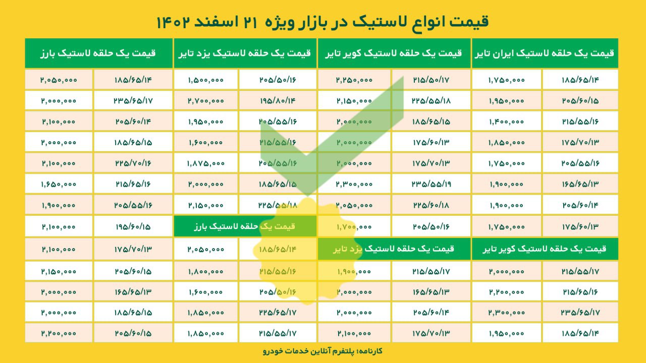 قیمت لاستیک در بازار – ۲۷ مرداد ۱۴۰۴