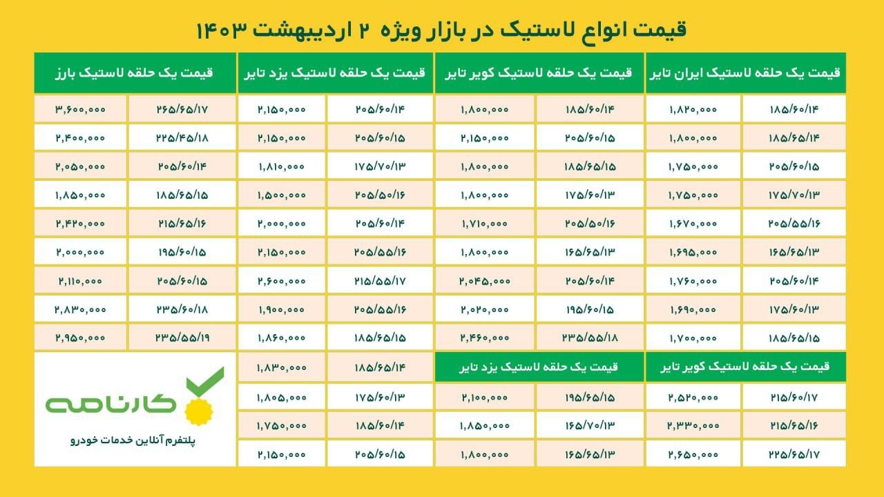قیمت انواع لاستیک در ۲ اردیبهشت ۱۴۰۳ به شرح ذیل است: